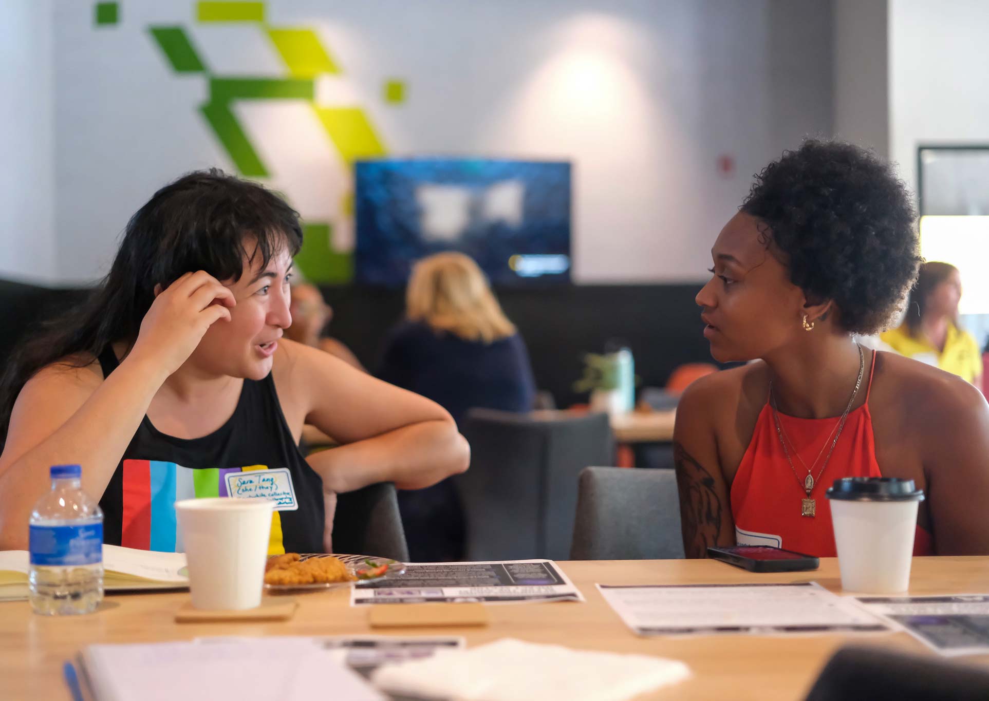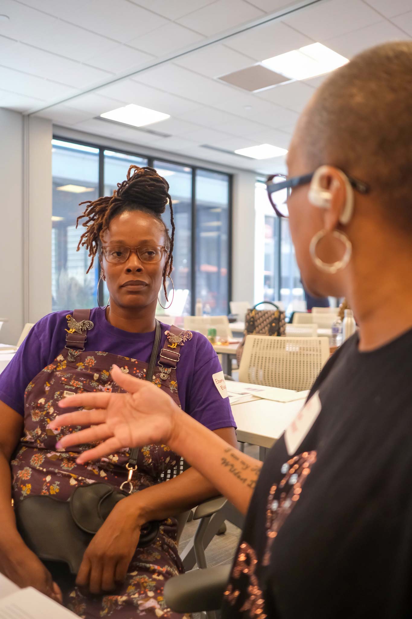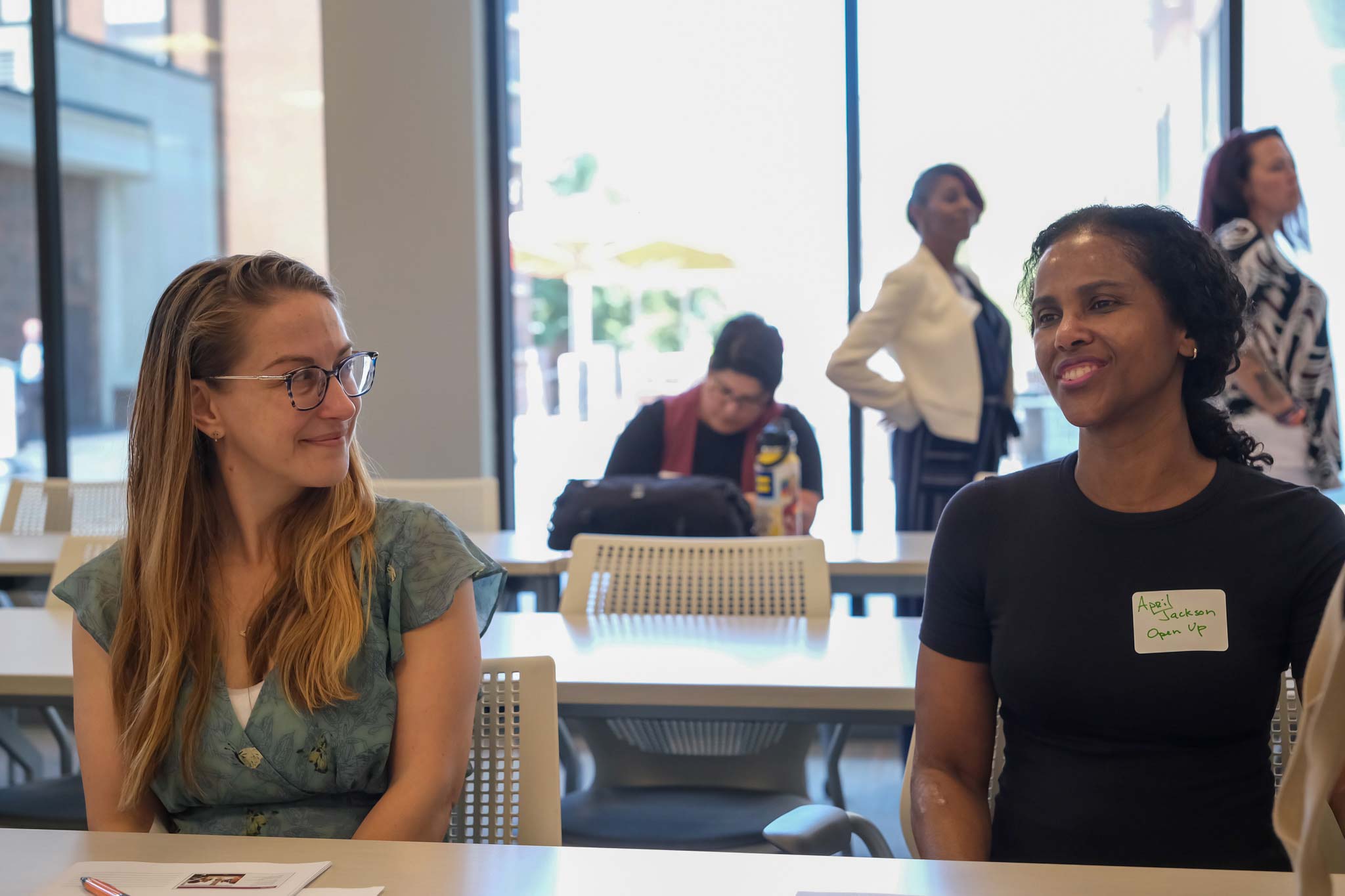 Chatting at the May 2024 grant-writing workshop held at Nova Place are Erin McAuley, left, and April Jackson, both with Open Up Pittsburgh, an organization that develops mindfulness tools through movement practices and interactive arts while centering people living with disabilities.