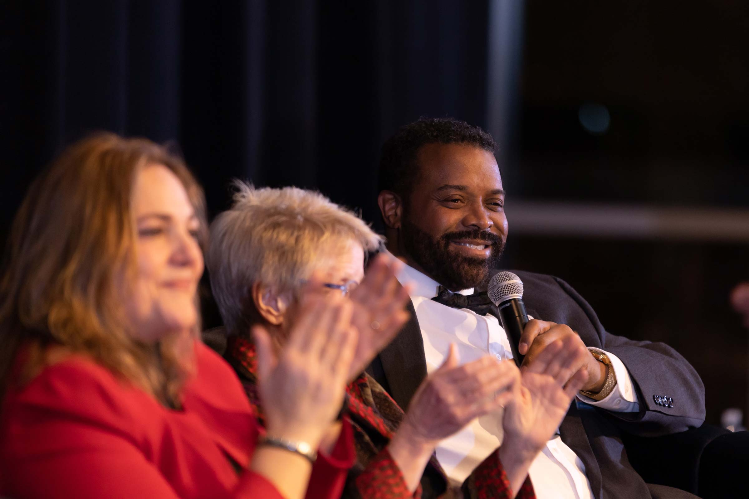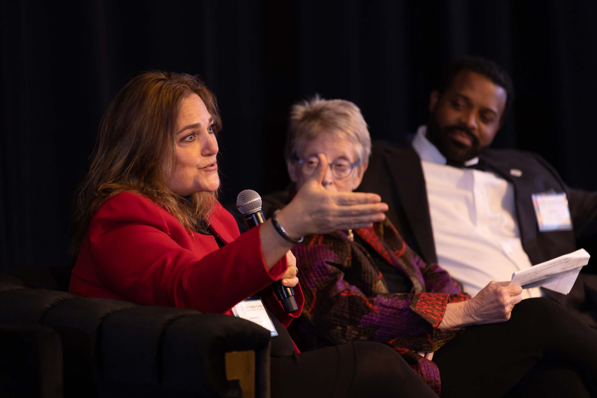 Forbes Funds President Fred Brown, seated with, from left, Buhl Foundation President Diana Bucco and former senior advisor at Dentons Cohen & Grigsby Kate Dewey, addresses a packed Sen. John Heinz History Center ballroom at the Nov. 17, 2022 40th anniversary celebration. This year, Forbes joined The Pittsburgh Promise and Neighborhood Allies to transition from serving the broader mission of The Pittsburgh Foundation as supporting organizations to being independent.
